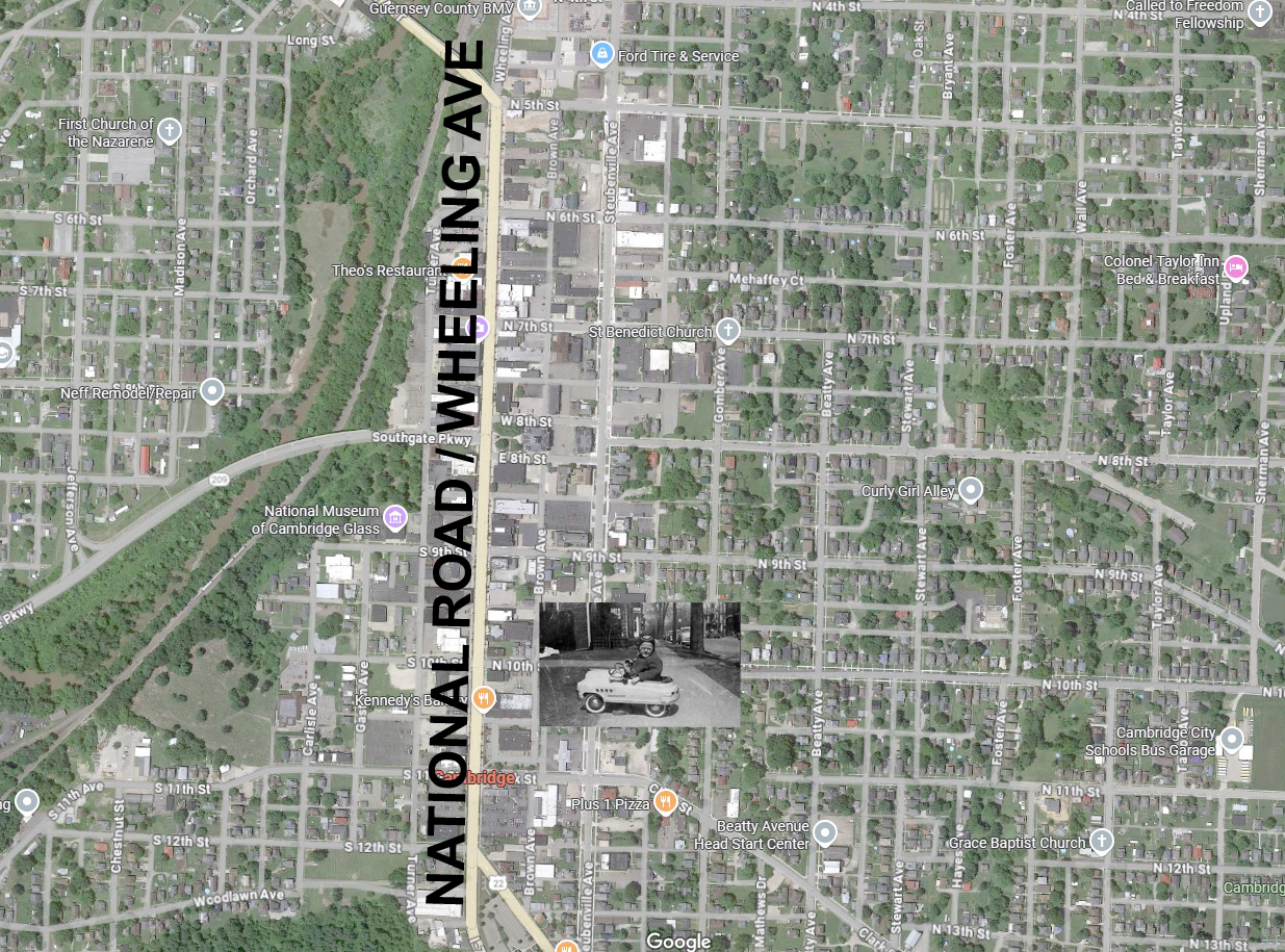 I lived my first four years a few houses just north of Wheeling Avenue, the main street of Cambridge, Ohio, and the original path of the National Road (below). It approached Wills Creek at the west end of town at the top of the map, the site of the first bridge in the newly formed Northwest Territory that only initially had a ferry for crossing. National Road lore has always been a part of my life.